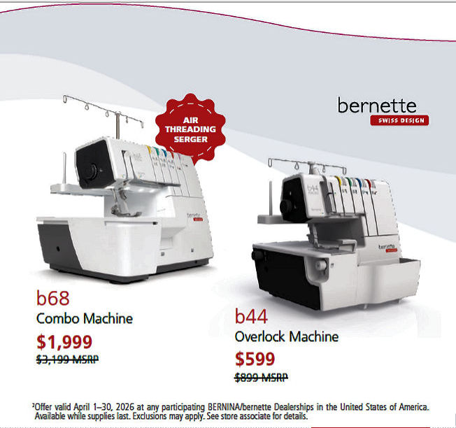 Machine Sale in-store Availability and Prices will never be better than NOW. Machine availability is a challenge - however, BERNINA and bernette machines are coming in daily and we have great machines for you to try; call or eMail us with a request for a sit-together time at the store.