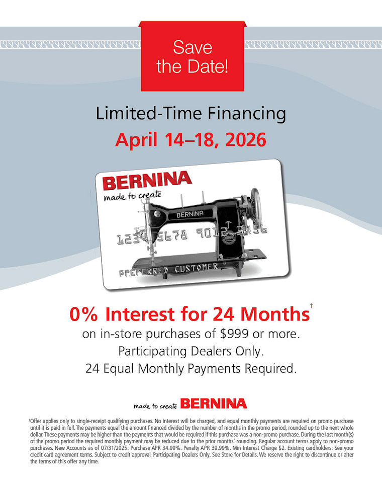 If you are considering a BERNINA and/or bernette Machine-purchase soon: Take advantage of the current machine availability and in-store pricing as well as as-long-as-available GiftsWithPurchase. Call the store (919 782 2945) to arrange a Try-Before-Buy session.