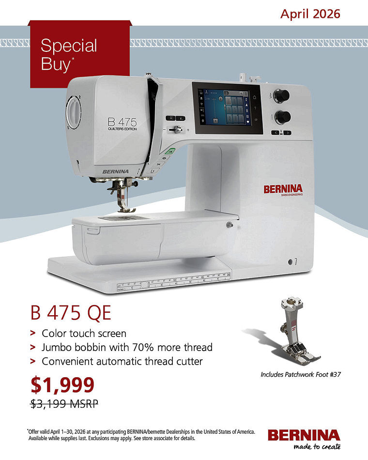 Machine Sale in-store Availability and Prices will never be better than NOW. Machine availability is a challenge - however, BERNINA and bernette machines are coming in daily and we have great machines for you to try; call or eMail us with a request for a sit-together time at the store.