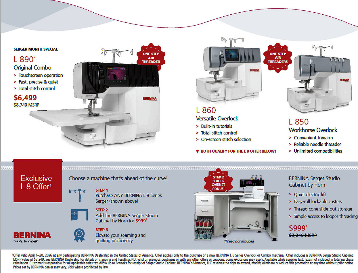 - Special Prices on Serger Machines and L8 Series Serger Furniture